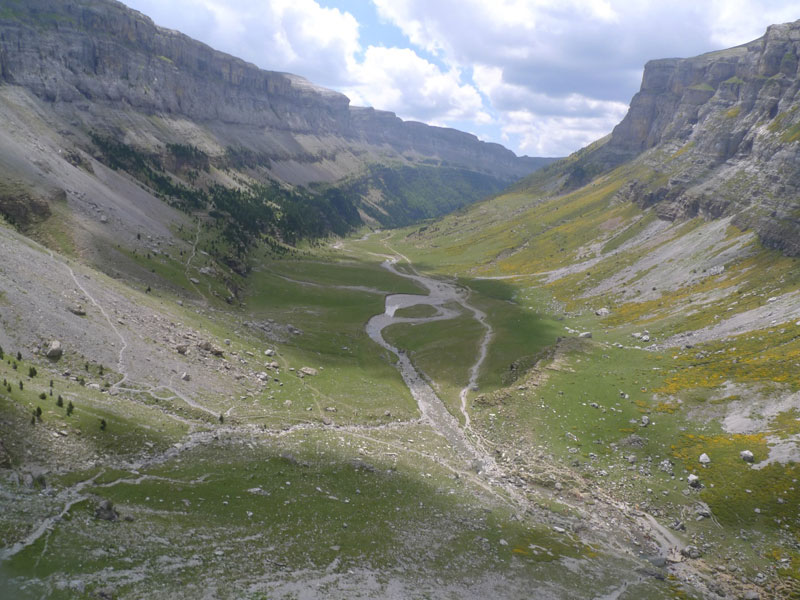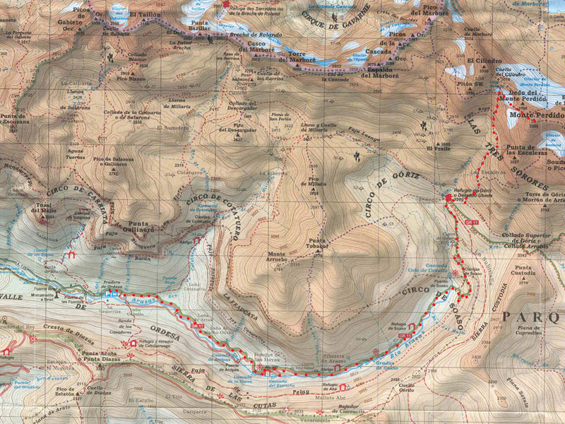 Aquí el camino cambia, y se gana desnivel bien por el camino de la parte derecha del fondo de valle, o recto por las clavijas de Soaso. Bonitas vistas sobre el circo de Soaso, gran modelado glaciar. Atravesando llanos salpicados de pequeños resaltes alcanzamos el refugio de Góriz (2160m) o también llamado Delgado Úbeda. Lo recomendable es pasar aquí la noche, y hacer una excursión más llevadera y disfrutarla al completo.